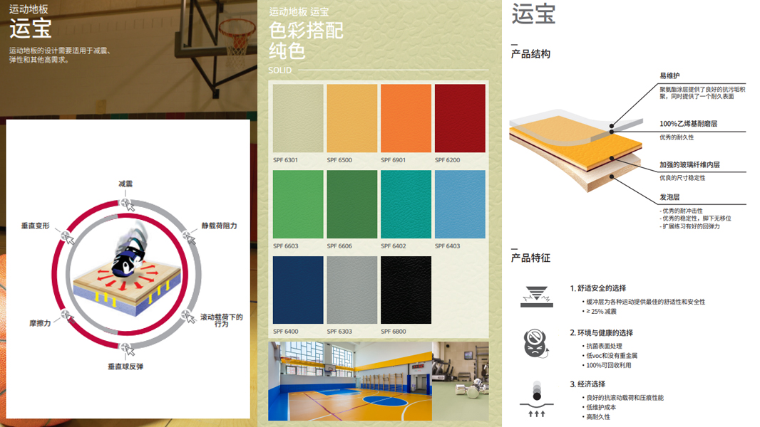其實運動PVC塑膠地板的適用范圍是非常廣泛的,常見的羽毛球、乒乓球、排球、籃球、網球等訓練場館,各類健身房,舞蹈房都是主要的使用場所。而相比普通商用的塑膠地板,運動塑膠地板應額外特別關注的,主要有以下幾項性能參數。