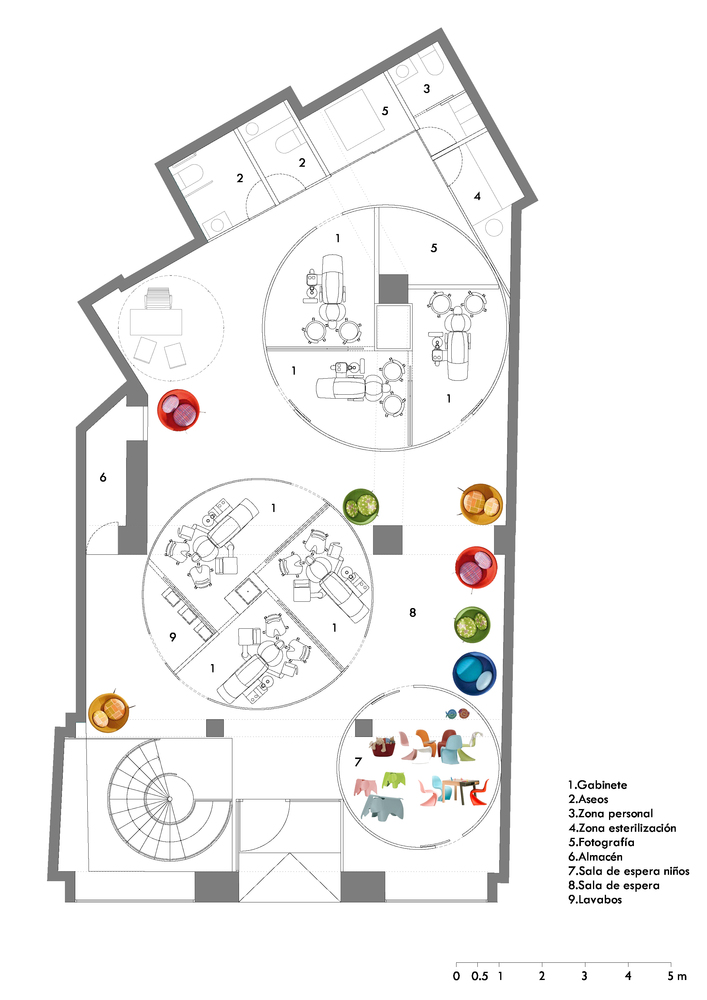 整個(gè)空間通過幾個(gè)圓柱體做了劃分,包括四個(gè)小型正畸診室、三個(gè)較大的治療室、一個(gè)兒童等候區(qū)和兩個(gè)接待區(qū);場地后部設(shè)有男女分開的廁所,設(shè)有殘疾人專用的女廁所、儲藏室、照明室、工作人員廁所和消毒區(qū)。另側(cè)地下室進(jìn)入后主要為診所的辦公區(qū)域,包括辦公室、會議室和辦公區(qū),以及雜物間。