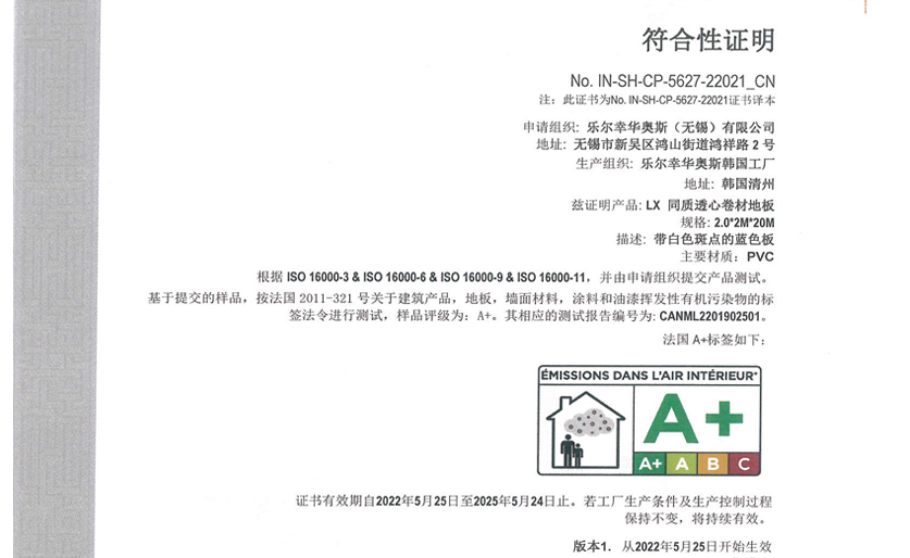 近日LX Hausys成功取得法國A+等級環保認證。此次認證的產品由上海SGS通用標準技術服務公司進行檢測,報告權威,國際認可。