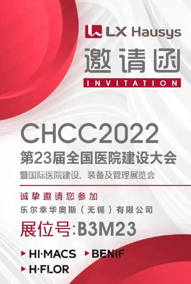 時隔一年,第23屆全國醫院建設大會暨國際醫院建設、裝備及管理展覽會(簡稱CHCC 2022)定于7月23~25日在武漢國際博覽中心隆重召開。屆時LXHausys(原LG塑膠地板)將攜旗下多款同質透心塑膠地板、人造大理石、裝飾貼膜等產品,重磅亮相CHCC2022現場B3M23展臺!讓我們一同武漢見!